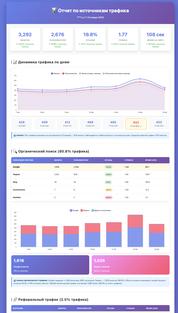 Инструмент работает с ключевыми метриками Яндекс Метрики: визиты, пользователи, динамика трафика, цели и конверсии, источники, поиск, устройства и регионы. Также он сравнивает периоды, анализирует поведение на страницах и считает конверсии по источникам и посадочным страницам.