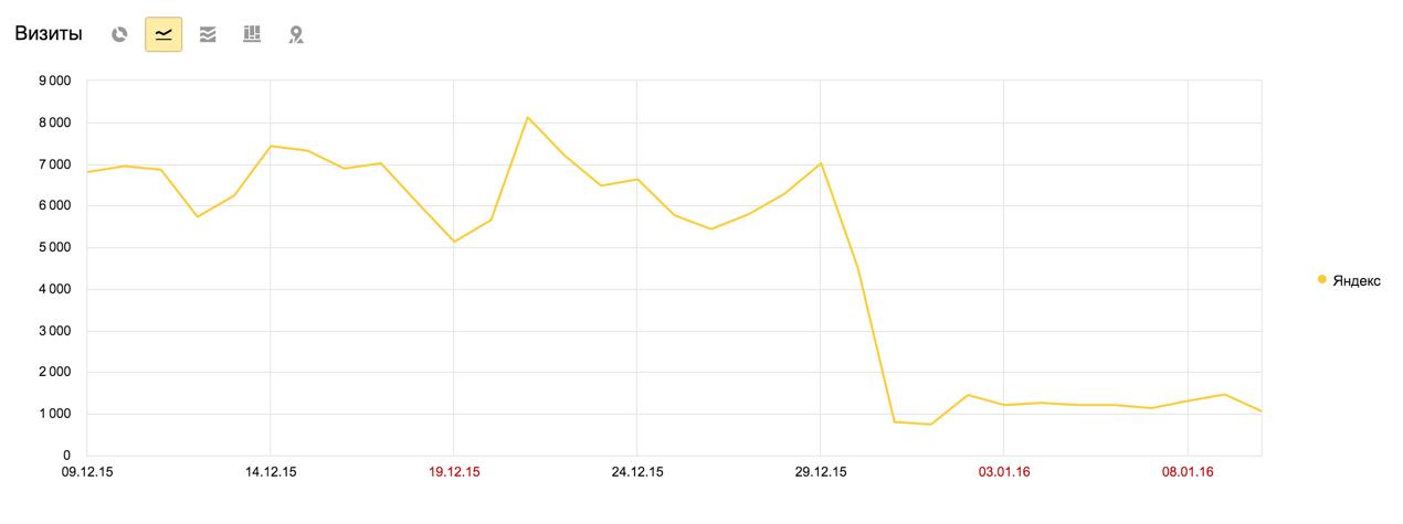 Сайт отметил Новый год под новым фильтром Яндекса. Практически по всем ключам было зафиксировано падение на 20-30 позиций. Органический трафик с отечественного поисковика также серьезно сократился, как видно на графике ниже.