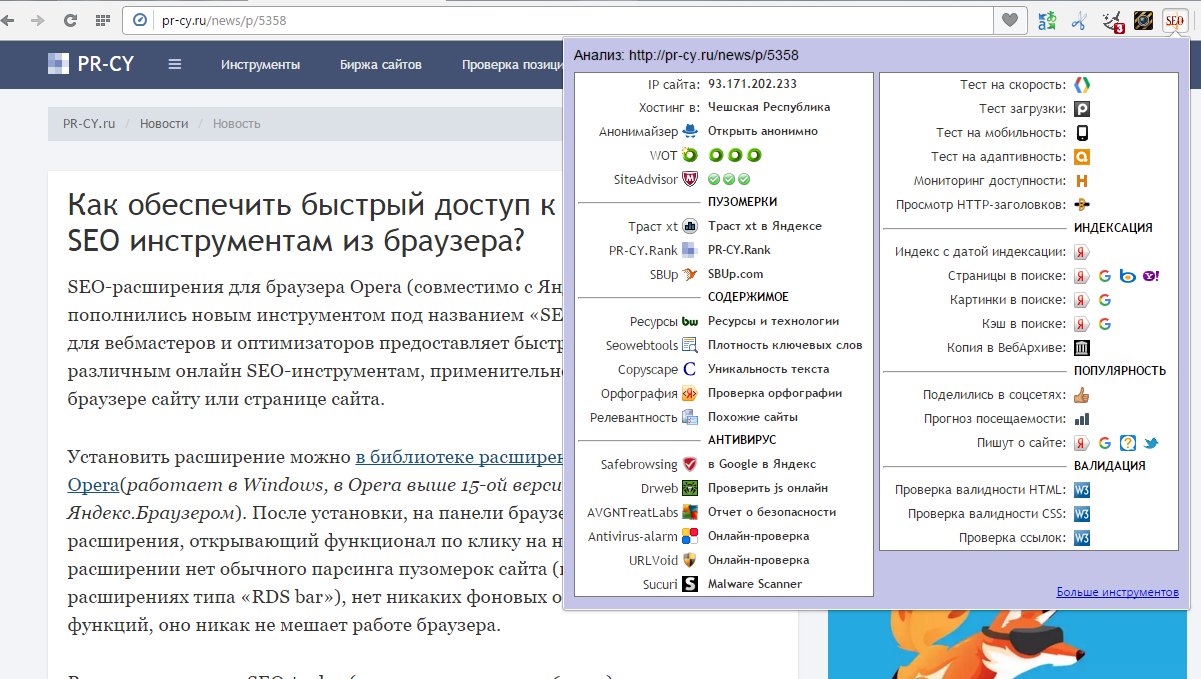Расширение «SEO-tools» также содержит ссылки на популярные сервисы аналитики сайтов, в том числе и на любимый всеми сервис http://pr-cy.ru