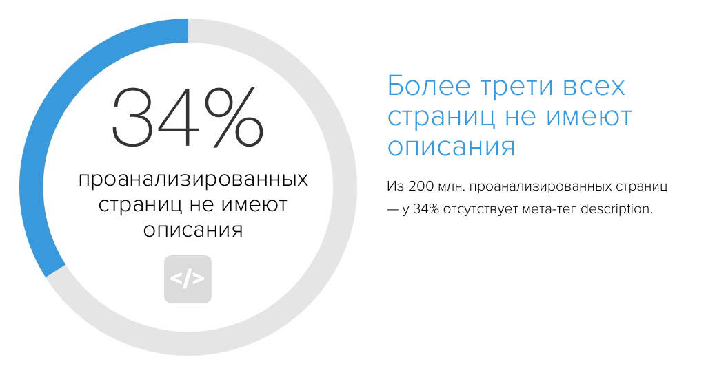 Исследование показало, что наиболее распространённые недочёты с описанием страницы ресурса чаще всего сводятся к слишком большому или слишком маленькому размеру текста данного тега. Оптимальное количество в 150 символов выдерживается веб-мастерами крайне редко. Кроме того, 34% проанализированных страниц (почти 70 млн.) вообще не имели описания.