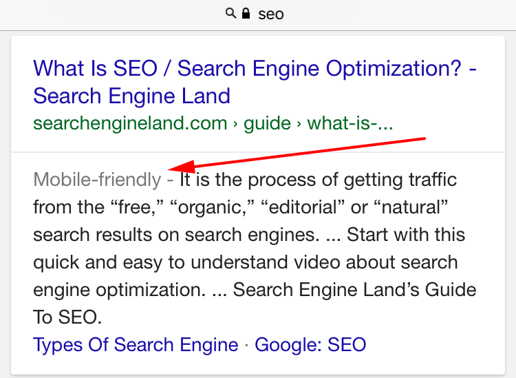 Такая маркирующая метка появился в результатах мобильной выдачи в ноябре 2014 года. Ее целью было выделять из всей совокупности страниц в выдаче те, которые «дружелюбны» по отношению к разного рода мобильным гаджетам. По идее, это должно было помочь пользователю быстрее находить «мобилопригодные» ресурсы, более удобные для просмотра посредством переносных устройств.