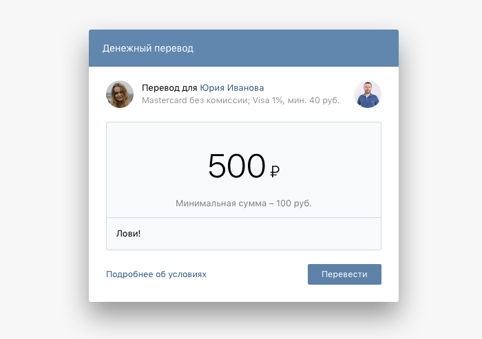 Непосредственный перевод денежных средств осуществляется в сообщениях посредством банковской карты отправителя. Удобство денежных переводов ВКонтакте заключается в том, что реквизиты получателя вообще указывать не нужно. Он самостоятельно извещает об этом Систему, задача же отправителя просто перевести нужную сумму адресату.