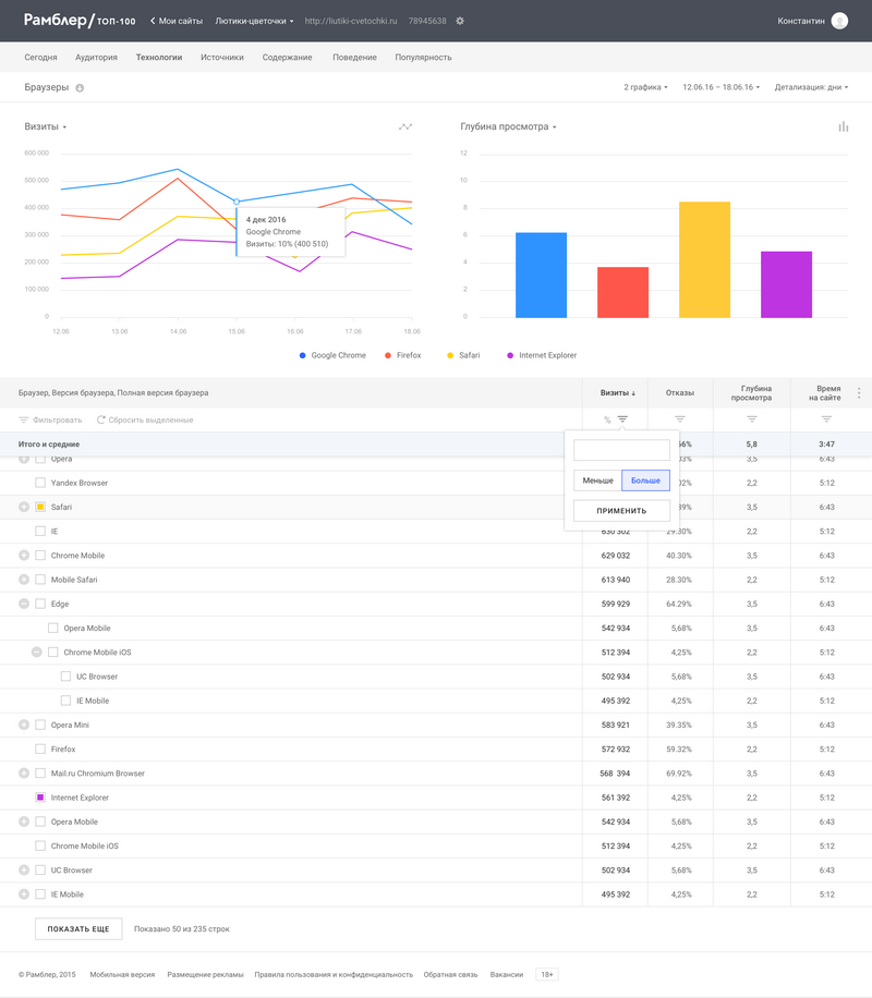 Разработчики системы веб-аналитики Рамблер/Топ-100 расширили ее функционал за счет добавления отчётов новых типов с широкими возможностями для детализации. Кроме того, девелоперы внедрили поддержку ключевых поведенческих факторов: времени на сайте, уровня отказов и глубины просмотра. Как отмечают представители Рамблера, чтобы появилась возможность агрегации поведенческих данных и их последующего анализа, вебмастерам и оптимизаторам придется добавлять дополнительную разметку в код страниц.