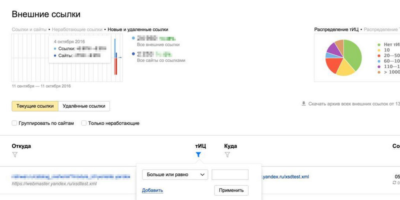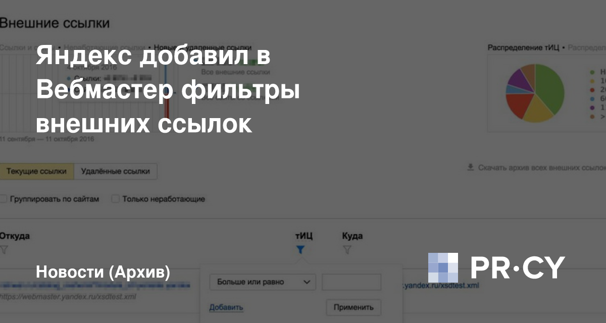 Не прошло и месяца с момента существенного улучшения функционала Яндекс.Вебмастера за счет появления графического представления данных о бэклинках в разделе "Внешние ссылки", как разработчики этого бесплатного сервиса в очередной раз порадовали оптимизаторов и вебмастеров. Они добавили в раздел "Внешние ссылки" целый ряд полезных фильтров.