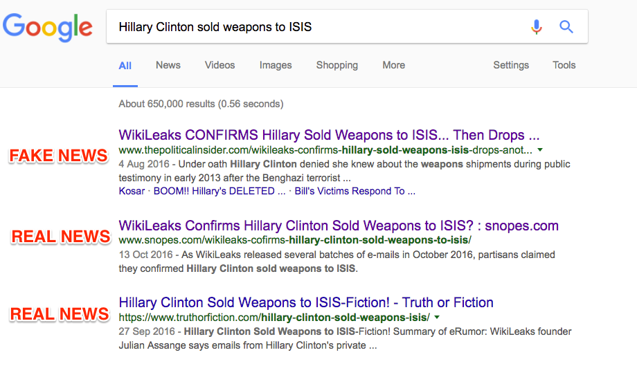 В качестве примера можно указать скрин (см. выше), из которого становится «очевидным», что Хиллари Клинтон торгует оружием с Исламским государством...
