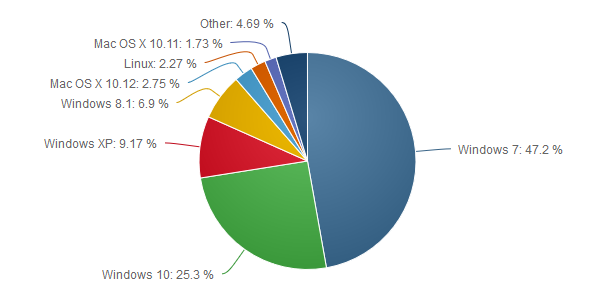 К примеру, свежее исследование Net Application демонстрирует, что с декабря 2016 года, когда доля Windows 10 в мире составляла 24,36%, она выросла на 1%, составив в январе 2017 года уже 25,3%. При этом в исследовании подчеркивается, что во второй половине прошлого года скорость распространения данной ОС несколько снизилась. Объяснение этому следует искать в отмене возможности бесплатно обновлять операционку до новой ее версии.