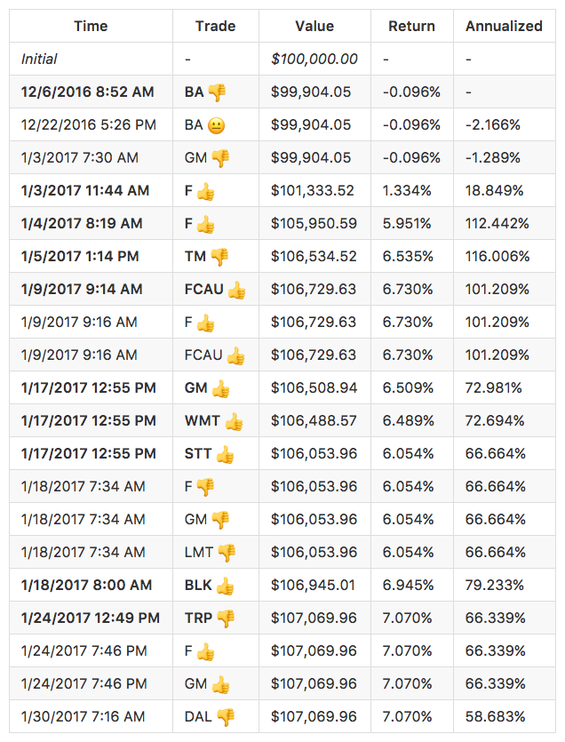 Удивительно, но это на самом деле работает. Трамп публикует много твитов о компаниях, и рынок, как оказалось, реагирует на это вполне предсказуемо. Как вы можете видеть в таблице ниже за авторством Брауна (на которой представлены результаты симуляции, а не итоги фактических торгов), робот зарабатывает деньги для своего создателя чаще, чем теряет их.
