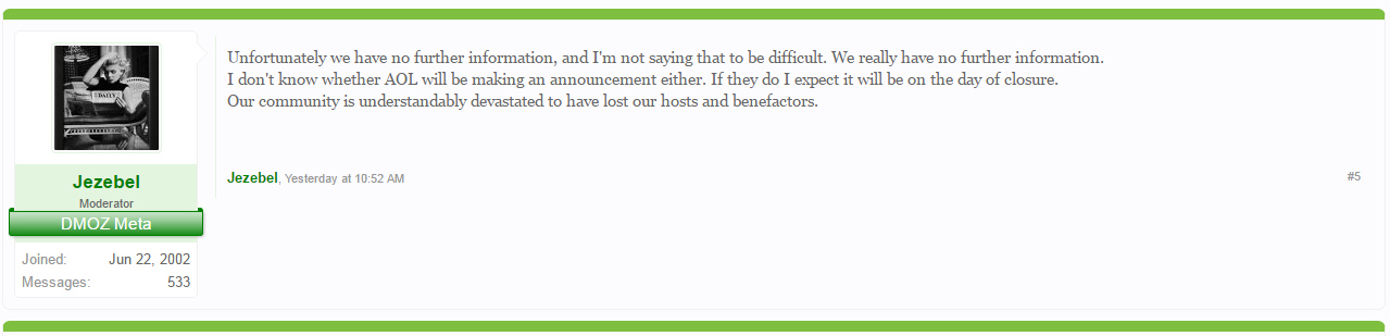 «К сожалению, у нас нет никакой конкретной информации о предстоящем закрытии. Кроме того, мы не знаем, будет ли какое-либо официальное заявления по этому поводу со стороны AOL. Если и да, то, скорее всего, оно состоится в день закрытия каталога. Все наше сообщество полностью опустошено таким известием».