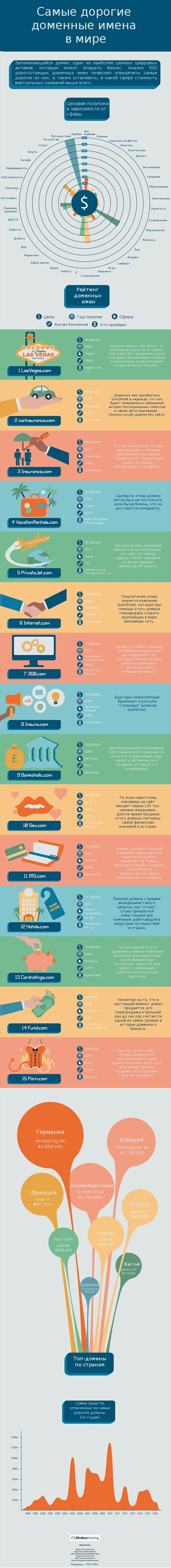 Nimbus Hosting проанализировал 500 самых дорогостоящих доменов на планете, определив «самые-самые» из них. Впрочем, представленная ниже инфографика не ограничивается только лишь суммой и годом покупки того или иного доменного имени. Вашему вниманию предлагаются также сведения о сферах (отраслях), в которых продаются самые дорогие домены; непосредственных покупателях; количестве бэклинков, указывающих на виртуальное имя, и многое другое.