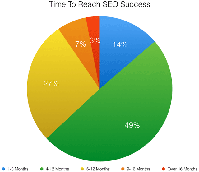 Сведения, демонстрируемые диаграммой, говорят о том, что свыше 90% оптимизаторов способны достичь позитивных результатов в продвижении сайтов в течение одного года (до истечения 12 месяцев с момента старта кампании по оптимизации). Эти данные подтверждают мнение экспертов Google, о котором мы писали ранее.