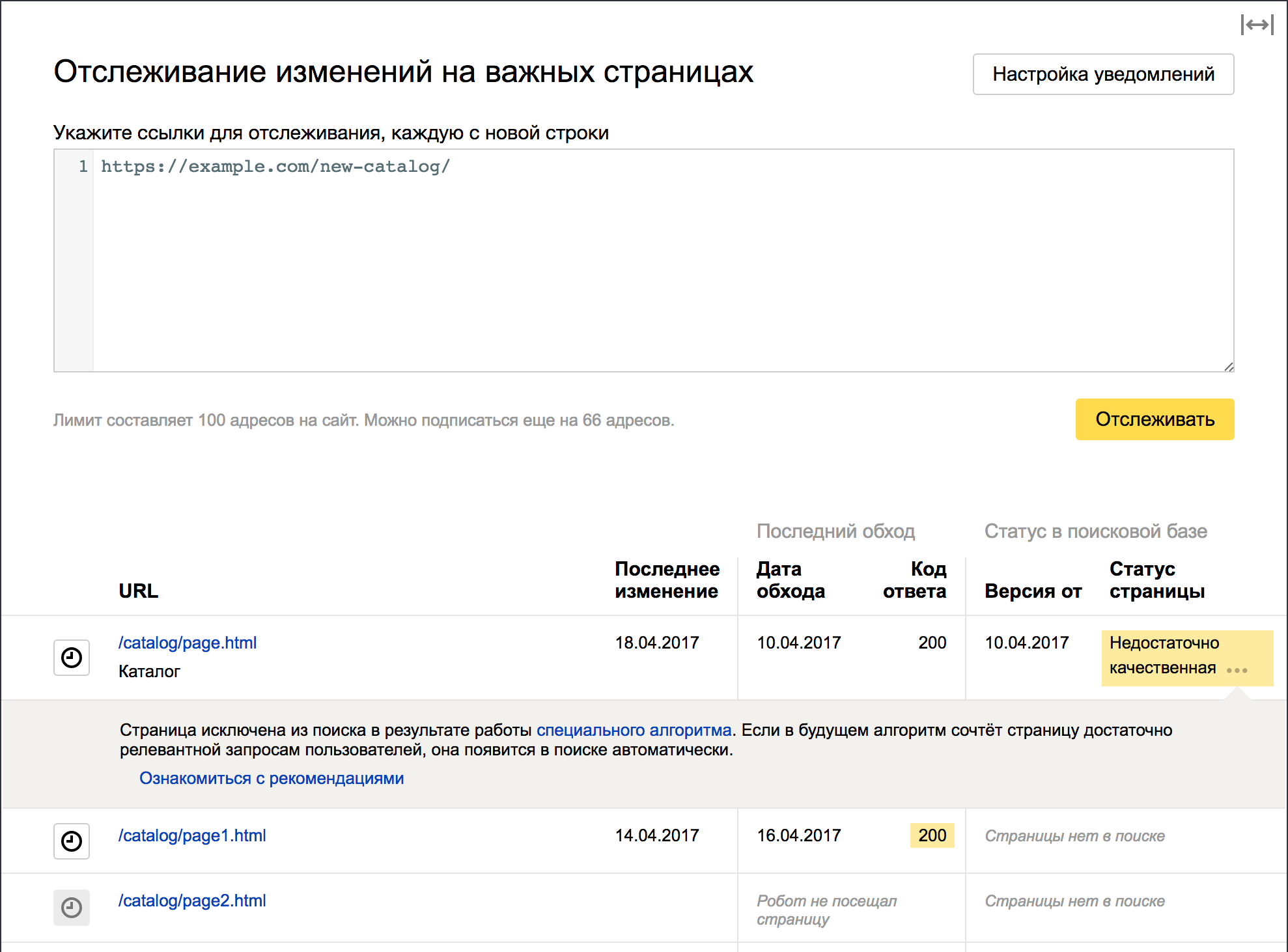Общее количество страниц, по которым разрешается вести мониторинг, не должно превышать 100 штук. При желании можно настроить отправку уведомлений об изменениях на электронную почту или в соответствующий раздел Яндекс.Вебмастера.