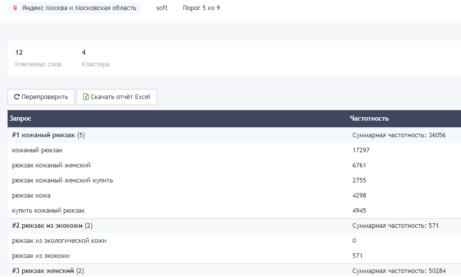 Сервис выдает разбитую на группы семантику, которую можно скачать в файле Excel или смотреть на экране.