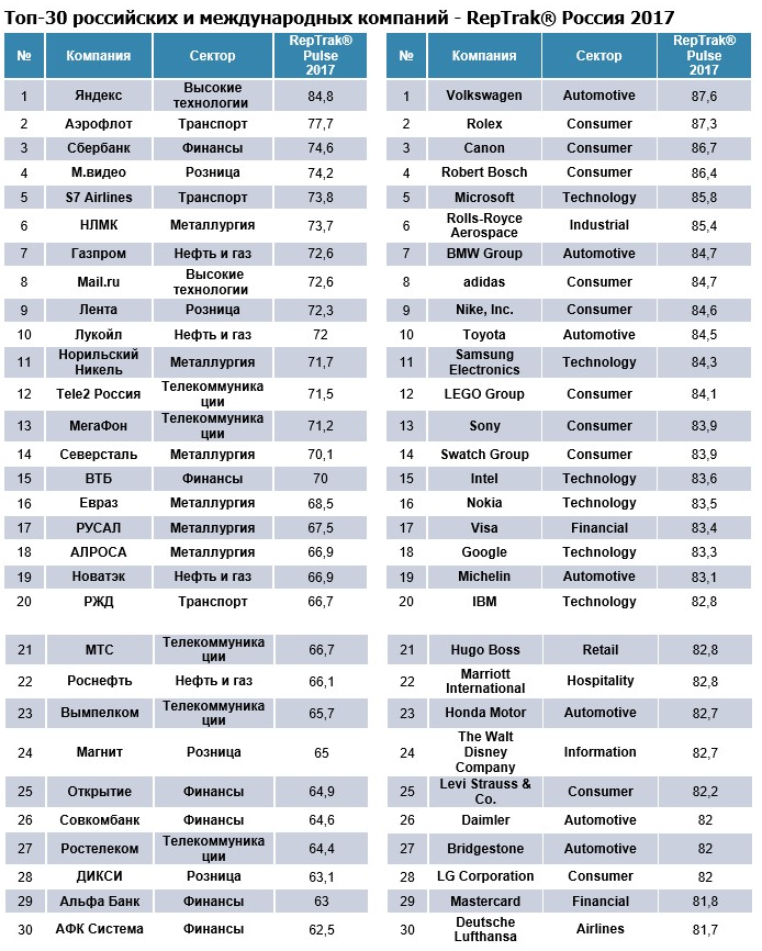 По итогам такого опроса было установлено, что национальной компанией с наивысшей репутацией на рынке является поисковик Яндекс (84,8 балла). Репутационным лидером среди зарубежных корпораций в России стал немецкий автогигант Volkswagen (87,6). Другие участники рейтинга представлены ниже.