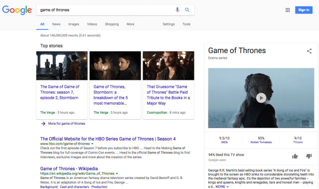 Скриншот доказывает, что выдача Google, сформированная в ответ на англоязычный запрос «Игра престолов» (прим. – название популярного американского сериала), и в самом деле содержит автопроигрывание соответствующего ролика. Традиционно русскоязычный Google таким похвастаться пока не может.