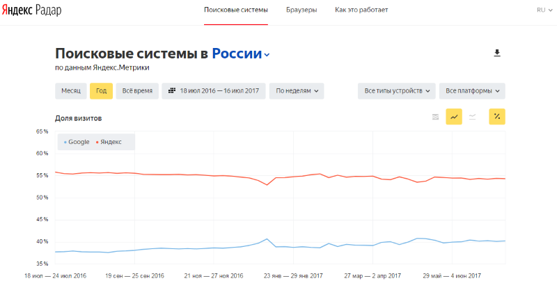 Последний, как утверждается на официальном сайте проекта, является «инструментом для анализа трендов на интернет-рынках отдельных государств». Говоря более понятным языком, Яндекс.Радар – сервис для анализа популярности отдельных поисковых систем и веб-браузеров в разных странах (на сегодняшний день – России, Беларуси, Казахстана и Турции).