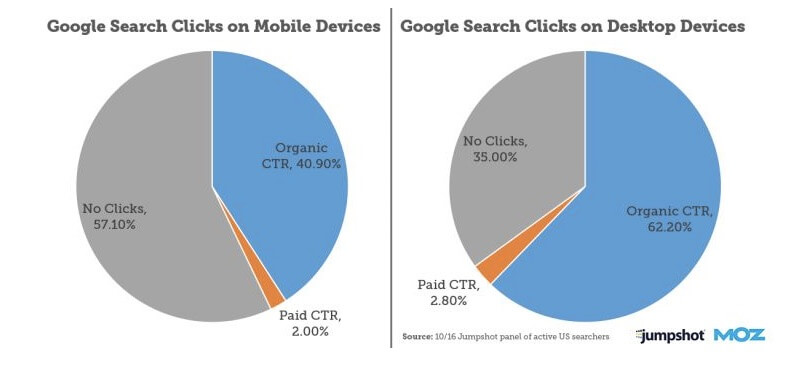 Повторюсь, все эти нововведения призваны максимизировать время, которые пользователи поиска проводят, взаимодействуя с продуктами, приносящими Google прибыль. Достаточно будет упомянуть, что недавнее исследование MOZ доказало на примере мобильного поиска ( который Google так настойчиво продвигает), что в большинстве своем (57%) пользователи оставляют мобильную выдачу, так и не совершив перехода по органической ссылке!