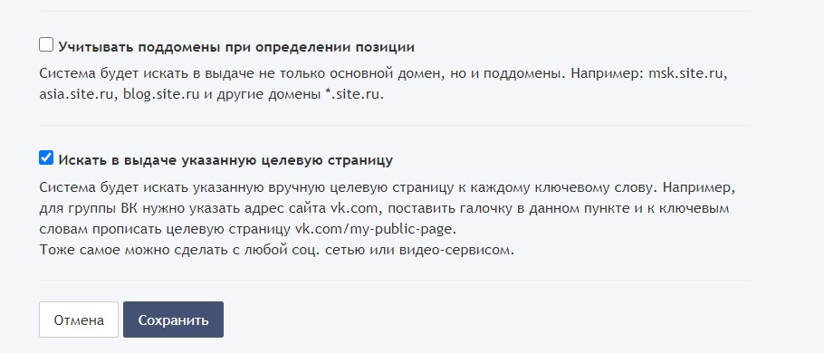 Пункт «Искать в выдаче указанную целевую страницу» позволит следить за позициями отдельных страниц. Так можно смотреть позиции групп в социальных сетях, профилей в видеосервисах. Для этого отметьте этот пункт галочкой и вместо адреса сайта укажите ссылку на страницу.