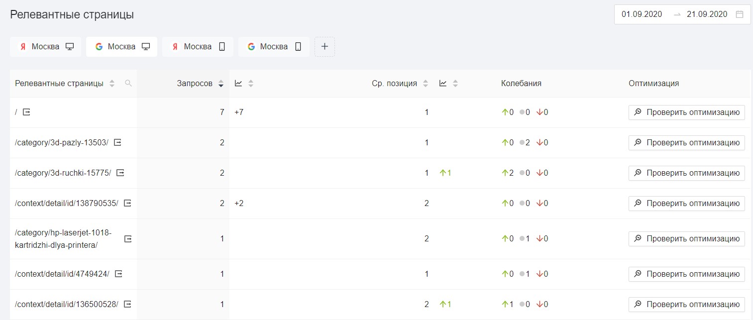 В отчете Релевантные страницы находится список URL страниц по ключевым словам, сервис отображает динамику позиций и колебания. Переключайтесь между выбранными настройками регионов и ПС вверху экрана и смотрите данные:
