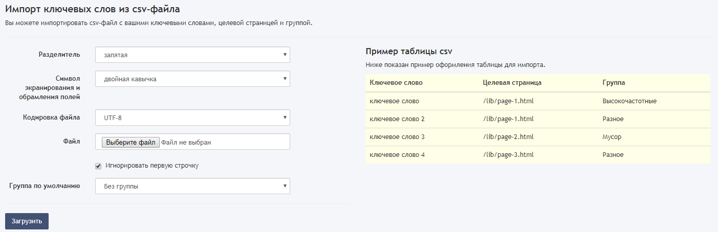 Вбить список запросов для отслеживания позиций нужно в разделе Добавить слова. Можно импортировать их из csv-файла: