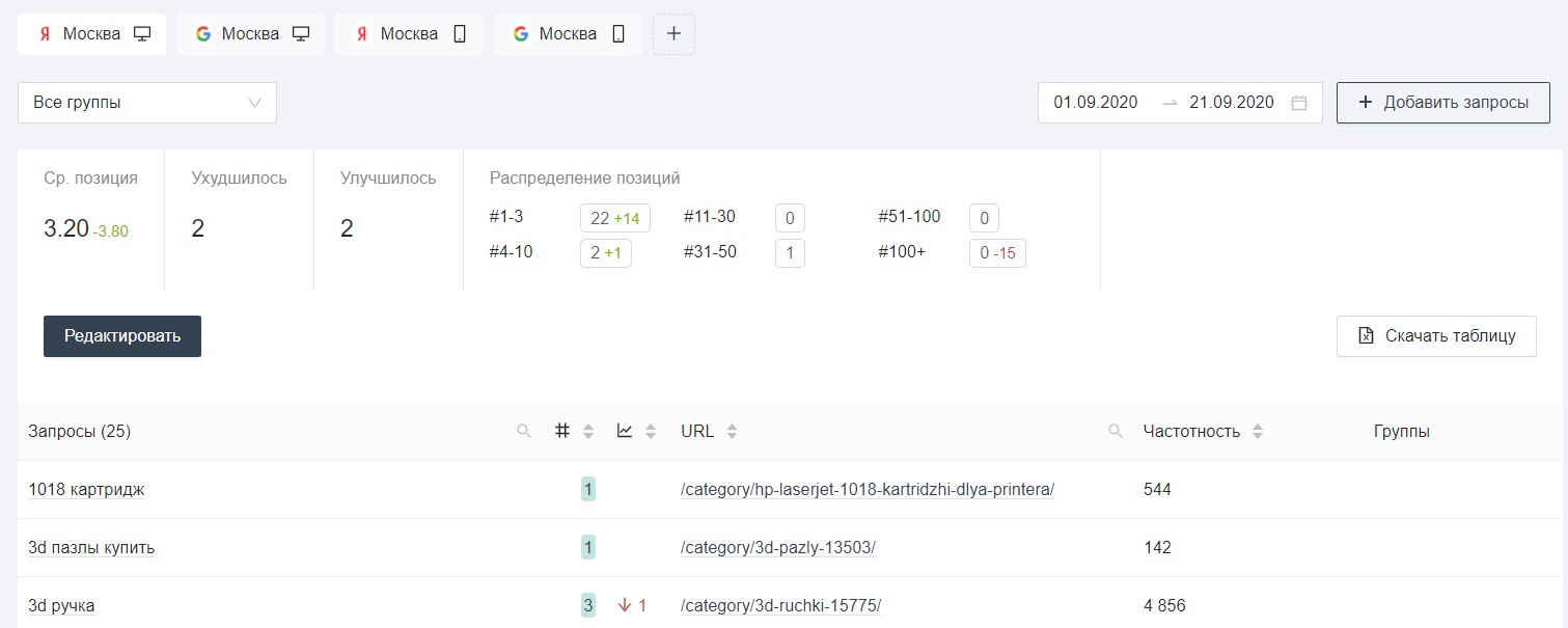 В разделе Запросы отображается статистика по добавленным ключевым словам. Во втором и третьем столбце со значком графика показано, на сколько в среднем выросла или упала позиция по сравнению с проверкой в прошлый раз.
