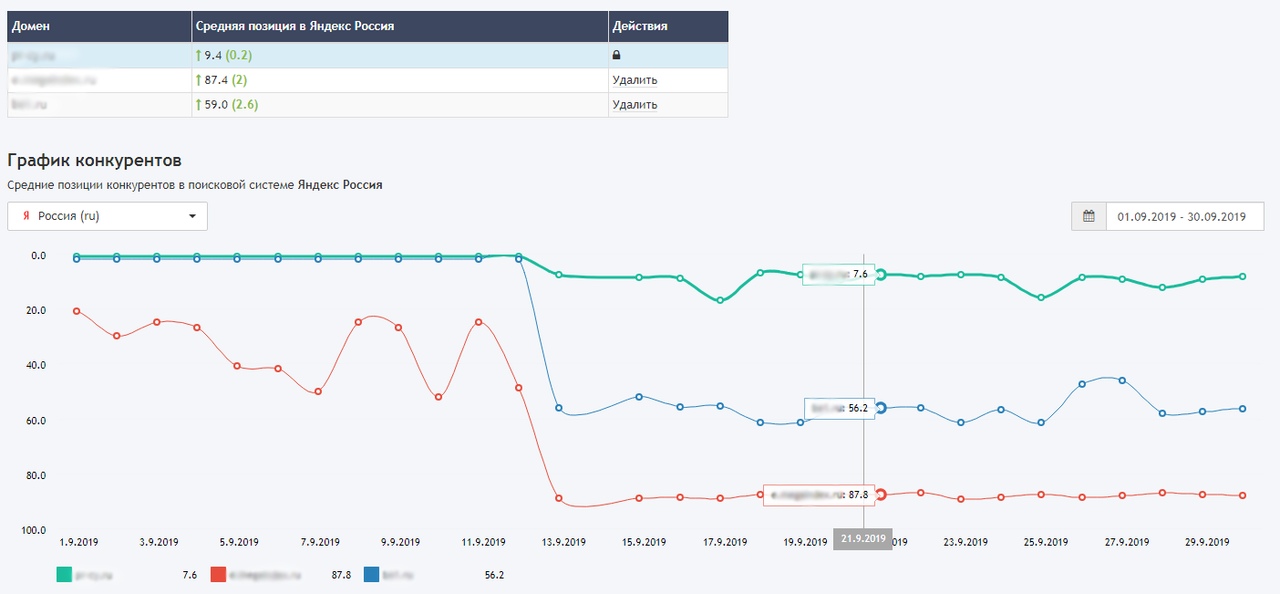 Вы можете добавить к своему сайту конкурентов и сравнивать успехи. В разделе Конкуренты добавьте до пяти адресов сайтов, которые вы хотите добавить к сравнению. Ниже появится сводка по средней позиции и график с динамикой. Наведите на точку на графике, чтобы увидеть числовые данные.