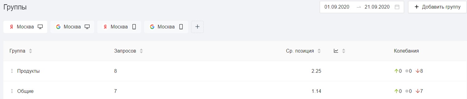 В отчете Группы можно следить за динамикой выделенных вами групп запросов: