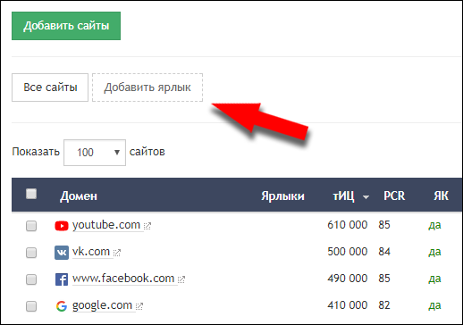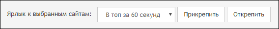 Ярлык появится в списке над таблицей. Выделите нужные сайты в таблице, выберите ярлык в списке «Ярлык к выбранным сайтам» справа под таблицей и нажмите кнопку «Прикрепить». Там же находится и кнопка снятия ярлыка.
