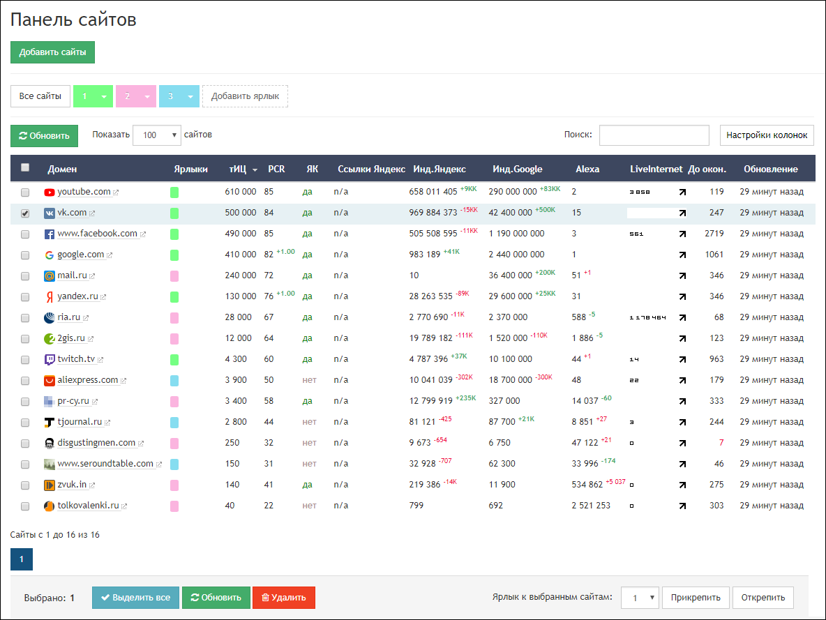 В таблице появятся данные из базы PR-CY. В дальнейшем можно будет обновить данные вручную — для этого выберите галочками нужные сайты и нажмите кнопку «Обновить». При этом в колонке «Обновление» появится иконка «Идет обновление».