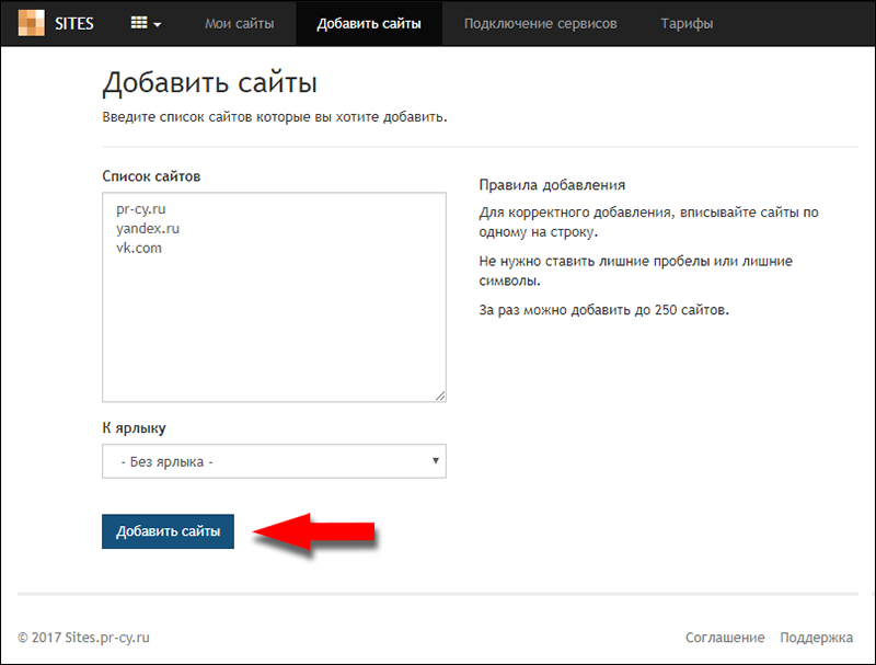 Кликните любую из кнопок «Добавить сайты». На открывшейся странице вы можете ввести сразу несколько сайтов – списком по одному на строку, до 250 адресов за раз. Здесь же вы можете выбрать ярлык к добавляемым сайтам, если они есть, или оставить «без ярлыка». Пропишите сайты и нажмите кнопку «Добавить сайты».
