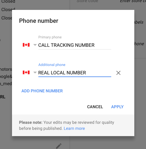- Используйте отслеживаемый номер в качестве "основного" на странице вашей компании на Google Мой Бизнес (если вы делаете это, убедитесь, что предоставили ваш настоящий местный номер в качестве "второго" номера).