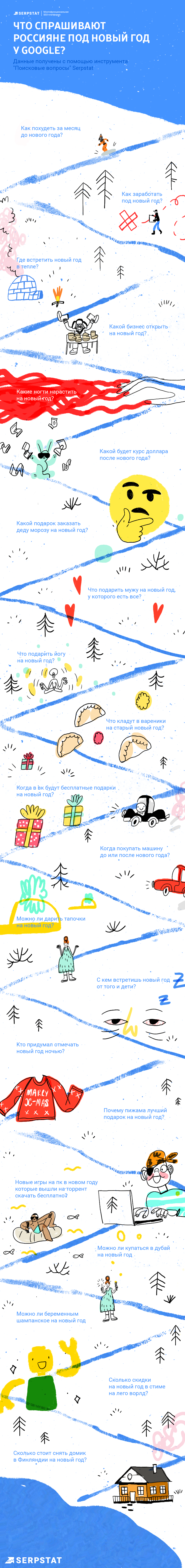 Специалисты из Serpstat в канун 2018 года провели познавательную аналитическую работу, призванную выяснить, какие именно поисковые запросы со словосочетанием «новый год» жители страны адресовали и, надо понимать, все еще продолжают адресовать Google.ru. Результаты своего исследования эксперты компании представили в виде красочной инфографики: