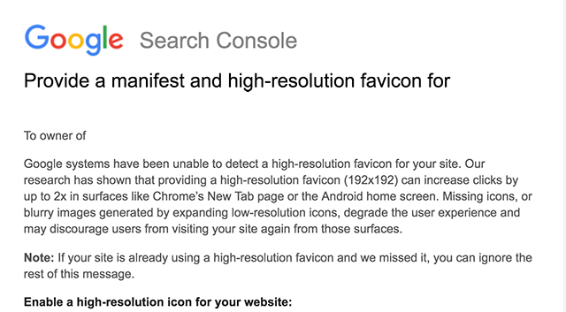 «Google не смог определить фавикон-изображение высокого качества для вашего сайта. Наши исследования доказывают, что наличие фавиконки высокого разрешения (192x192) может в два раза увеличить количество переходов на сайт, например, из браузера Chrome. Отсутствие же такой иконки или ее низкое качество (разрешение) может негативно сказаться на пользовательском опыте. Как следствие, такие пользователи в будущем могут отказаться от повторного посещения страниц вашего ресурса.