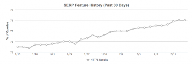 Весьма схожи результаты присутствия HTTPS-страниц в ТОПе Google и у другого аналитического инструмента – Mozcast. Специалисты последнего настаивают, что доля таких ресурсов достигла 78% от их общего числа на первой странице выдачи американской поисковой системы: