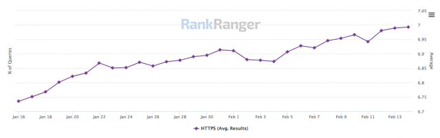 В частности, один из них, сервис RankRanger, убежден, что на первой странице результатов поиска Google количество HTTPS-сайтов достигает 70%. Соответствующая этому утверждению статистика прилагается: