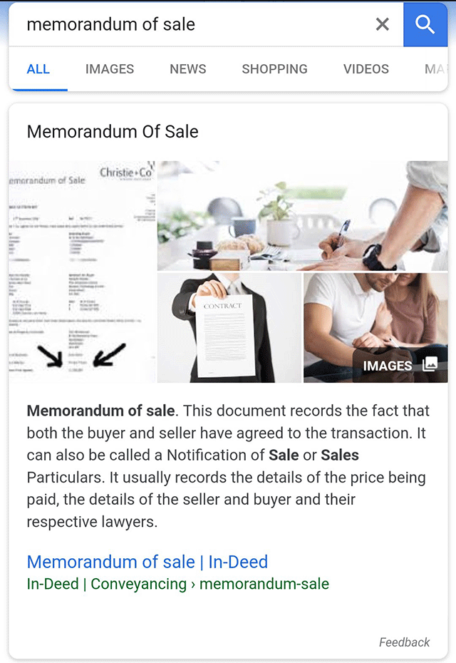 Как видно, готовый ответ на англоязычный поисковый запрос «memorandum of sale» (рус. – предварительный договор о покупке) в SERP снабжен картинками. Удивляет то обстоятельство, что не одной, а сразу целой серией тематических изображений.