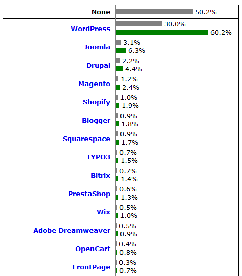 Любопытным может также показаться тот факт, что чуть более половины всех сайтов (50,2%), как выяснилось, вообще не используют CMS, которые пытались обнаружить и подсчитать в W3Techs.