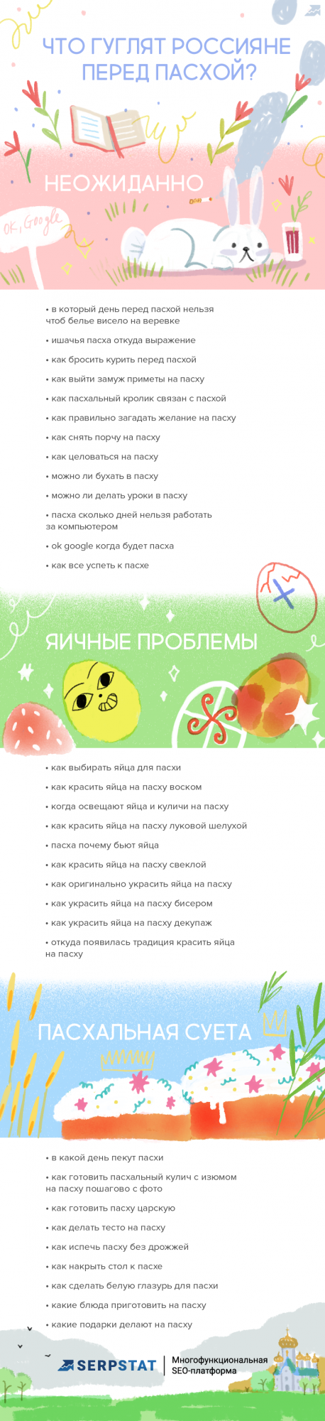 Пасха в этом смысле не исключение. По просьбе наших коллег из SEOnews, многофункциональная SEO-платформа SerpStat представила красочную инфографику того, что пытаются отыскать наши соотечественники с помощью Google за несколько дней до Пасхи: