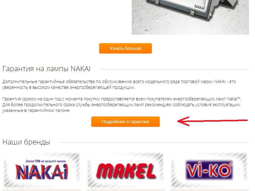 Описание гарантий с кнопкой «Подробнее о гарантии», которая ведет на сайт компании в раздел гарантий.