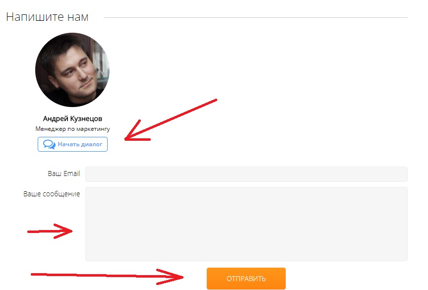 Форма связи с фотографией и контактной информацией представителя компании и возможностью написать в чат с индикатором, отображающим онлайн-статус представителя: