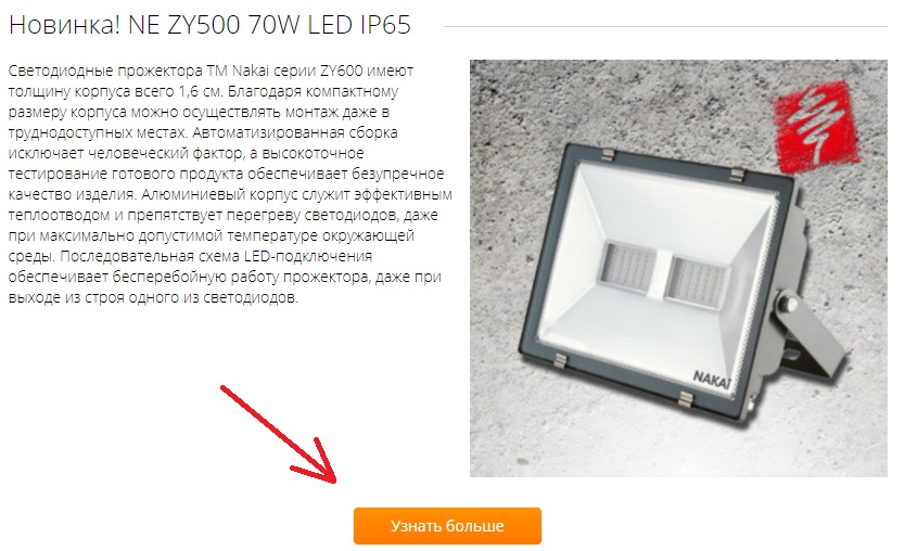 Блок с информацией о новинках в ассортименте с кнопкой «Узнать больше», ведущей на страницу товара.