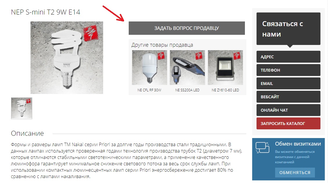 Каталог продукции, где каждый товар имеет свою страницу с описанием, фотографией и кнопкой призыва к действию «Задать вопрос продавцу»: