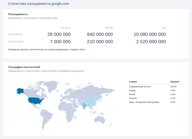 - посещаемость ресурса по открытым счетчикам или на основе данных рейтинга Alexa, если открытых счетчиков нет;