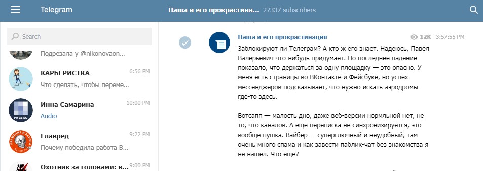 В Телеграме совсем нет ленты постов, но на левой стороне экрана всегда висит список каналов, на которые подключена подписка. Когда на канале выходит пост, он поднимается наверх. Все просто — чтобы канал был на виду в начале списка, посты должны быть регулярными. Обычно каналы публикуют материал раз в один или два дня, поэтому лучше публиковать что-то не реже.