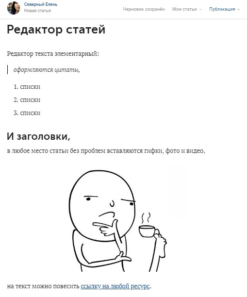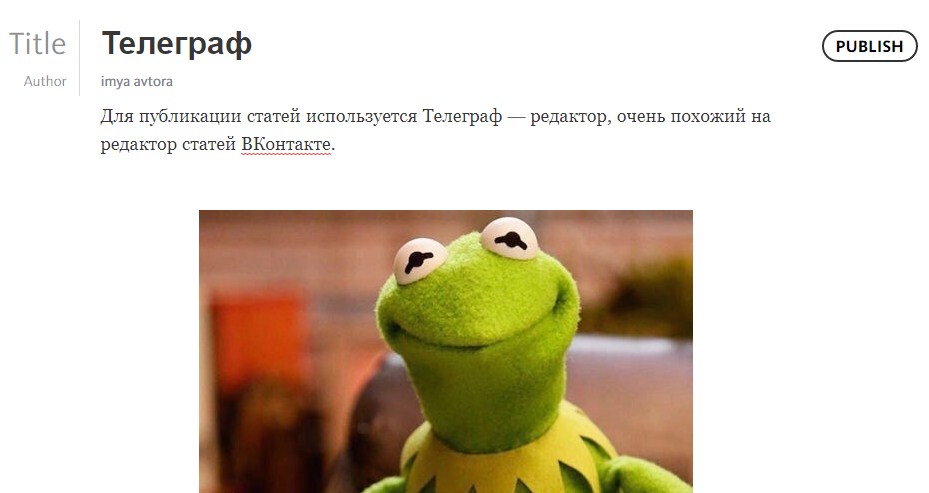 Для публикации статей используется Телеграф — редактор, очень похожий на редактор статей ВКонтакте.
