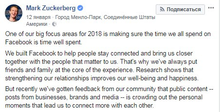 В январе 2018 года Марк Цукерберг выложил пост, в котором сказал, что главная цель Фейсбука* — обеспечить людям общение друг с другом, но в последнее время социальную сеть наполнили бизнес-аккаунты с публичным контентом, которые этому общению мешают. Из-за этого Поддержка пересмотрела алгоритмы ранжирования постов.