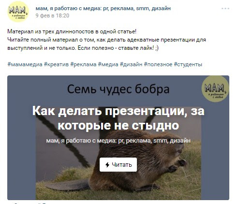 Все перечисленные виды контента подходят для публикации в ВКонтакте. Есть мнение, что пользователи ВКонтакте не любят читать тексты, им подавай картинки, мемы и видео. Возможно, причина в том, что раньше длиннопосты было не очень удобно читать. Нельзя было выделять заголовки, цитаты, вставлять иллюстрации в середину текста, лонгрид открывался в ленте сразу и не сворачивался. Выходом был формат вики-страничек, где было больше инструментов редактирования текста: заголовки трех уровней, списки, изменение расположения текста, вставка иллюстраций, довольно удобный редактор.