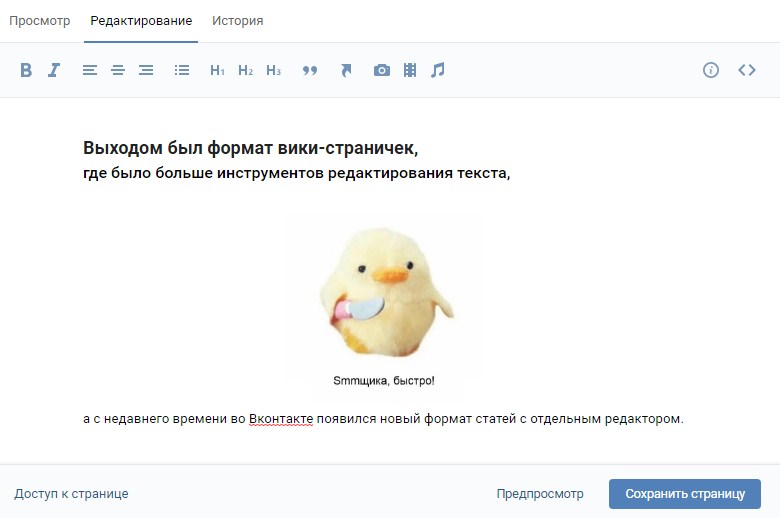 А не так давно в ВКонтакте появился формат статей с отдельным редактором. В целом это похоже на вики-редактор, но проще и удобнее. Не нужно отдельных ссылок, кнопка редактора находится прямо на панели: