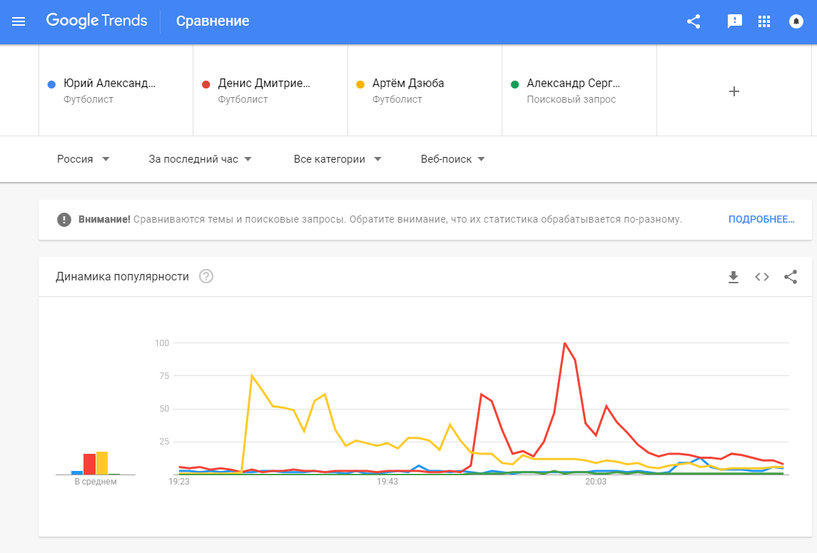 В день старта ЧМ-2018 по футболу, 14 июня, российские пользователи также проявляли повышенный интерес к таким темам, как «Россия Саудовская Аравия смотреть онлайн», «футбол Россия Саудовская Аравия», «счет Россия Саудовская Аравия», «Робби Уильямс», «Артем Дзюба», «Александр Головин», «Денис Черышев» и др.
