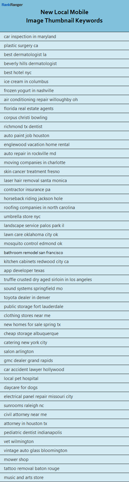 Аналитики RankRanger также представили общественности список ключевиков, по которым до 13 июля превью изображений в североамериканском поиске не демонстрировались, а с указанной даты стали отображаться: