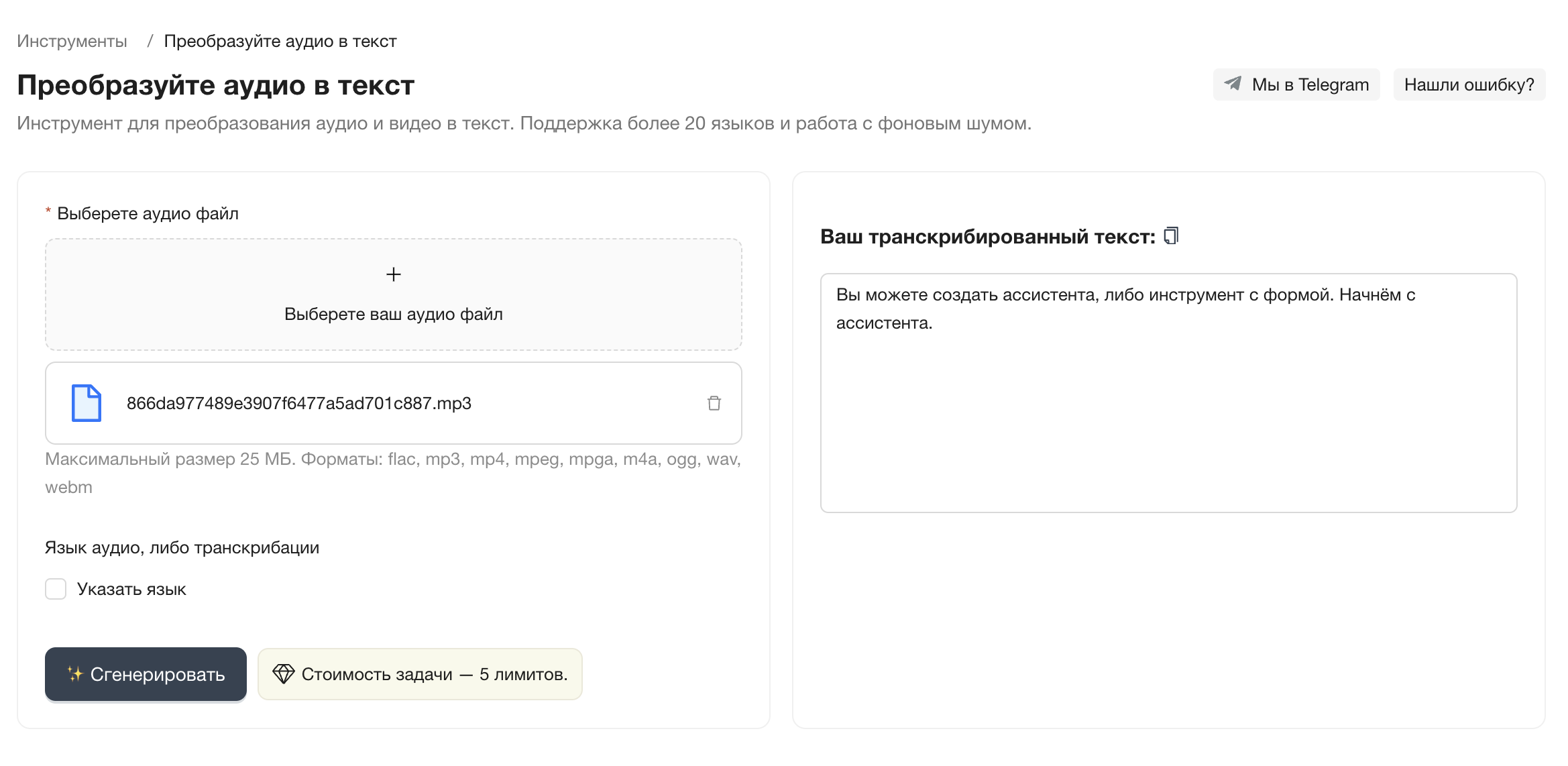 Сервис предлагает удобный инструмент для обработки аудио. Цена составляет 5 лимитов за минуту аудио. После регистрации пользователи получают 10 лимитов в день, что соответствует примерно 2 минутам аудио. Сервис поддерживает автоопределение языка и охватывает более 50 языков, что делает его многофункциональным. Максимальный размер загружаемого файла составляет 25 МБ, а поддерживаемые форматы включают flac, mp3, mp4, mpeg, mpga, m4a, ogg, wav и webm. Это делает pr-cy отличным выбором для тех, кто ищет простое и быстрое решение для работы с аудио.